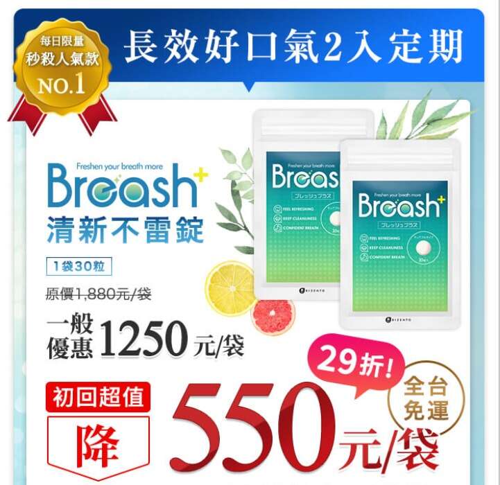 BREASH清新不雷錠官網限時推出的超省2入定期方案